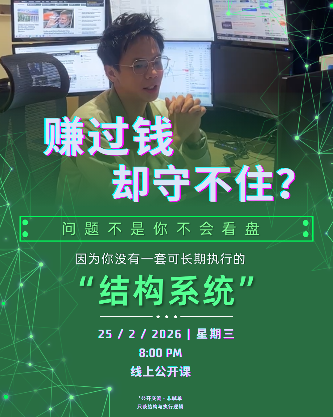 本课程通过*“诊断-重塑-标准化”三维路径,解决散户亏损核心痛点。第一阶段 聚焦风险计算*,通过统一风控语言(Risk/Pip/Cost)与个人底线算法,优先生存后谈盈利,强制切除乱下重仓的肿瘤;第二阶段 攻克结构透视,利用“结构三步法”与关键位优先级,建立“不交易清单”(Do-Not-Trade List)过滤市场噪音;第三阶段落实行为转化,精准定位个人最高昂的错误习惯,将其硬化为无情绪干扰的执行规则。三个阶段的时间,将你的交易从“直觉博弈”转化为一套可量化、可进化的职业级骨架系统。